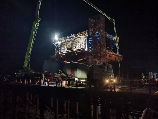 據(jù)項目負責人介紹,此次澆筑完成的標段最大跨度60+2*90+60米連續(xù)箱梁右幅83號主墩0號塊,長12米、高5.5米,寬16.55米,混凝土使用方量為433.6立方米,采用支架現(xiàn)澆的施工工藝,施工過程中存在澆筑難度大、施工時間長、安全風險高等情況。該連續(xù)梁“0號塊”順利澆筑完成,標志著東陽特大橋轉(zhuǎn)入上部結(jié)構(gòu)施工階段。為了確保此次連續(xù)梁0號塊順利澆筑,在南昌市建投集團的統(tǒng)一部署下,施工單位精心組織,多次進行施工技術(shù)交底,明確從支架搭設到模板安裝、鋼筋幫扎等各個工序、環(huán)節(jié)的技術(shù)規(guī)程和操作規(guī)范,確保澆筑過程中的安全質(zhì)量有序可控。